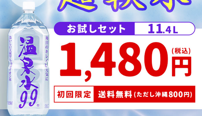 温泉水99は、飲料水としてはもちろん、料理、お茶・コーヒー用としても安心して使える本当に美味しい水です。
